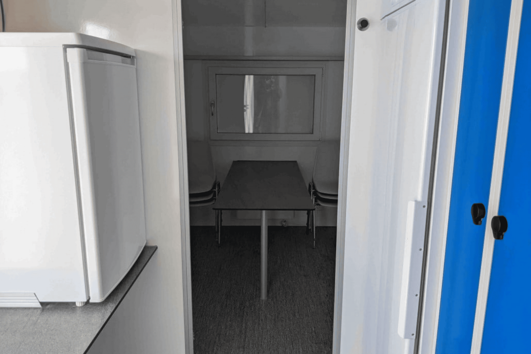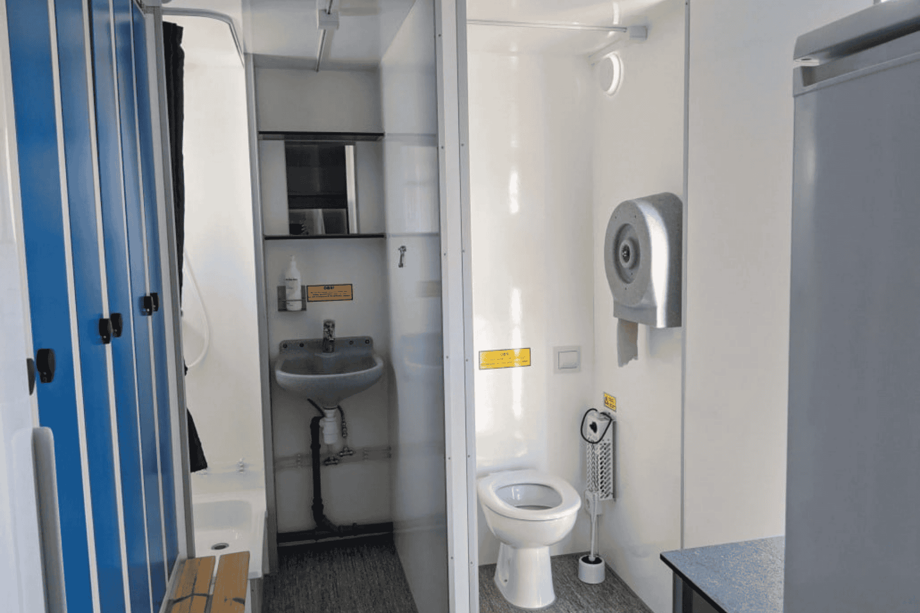 Klädhängare, spegel, anslagstavla, 1 bord, 6 stolar, kaffemaskin, kylskåp, dusch, handfat, toalett med kvarn, teknikrum, torkskåp, 6 stålskåp. Utrustad med slanghållare och avfallsställ.