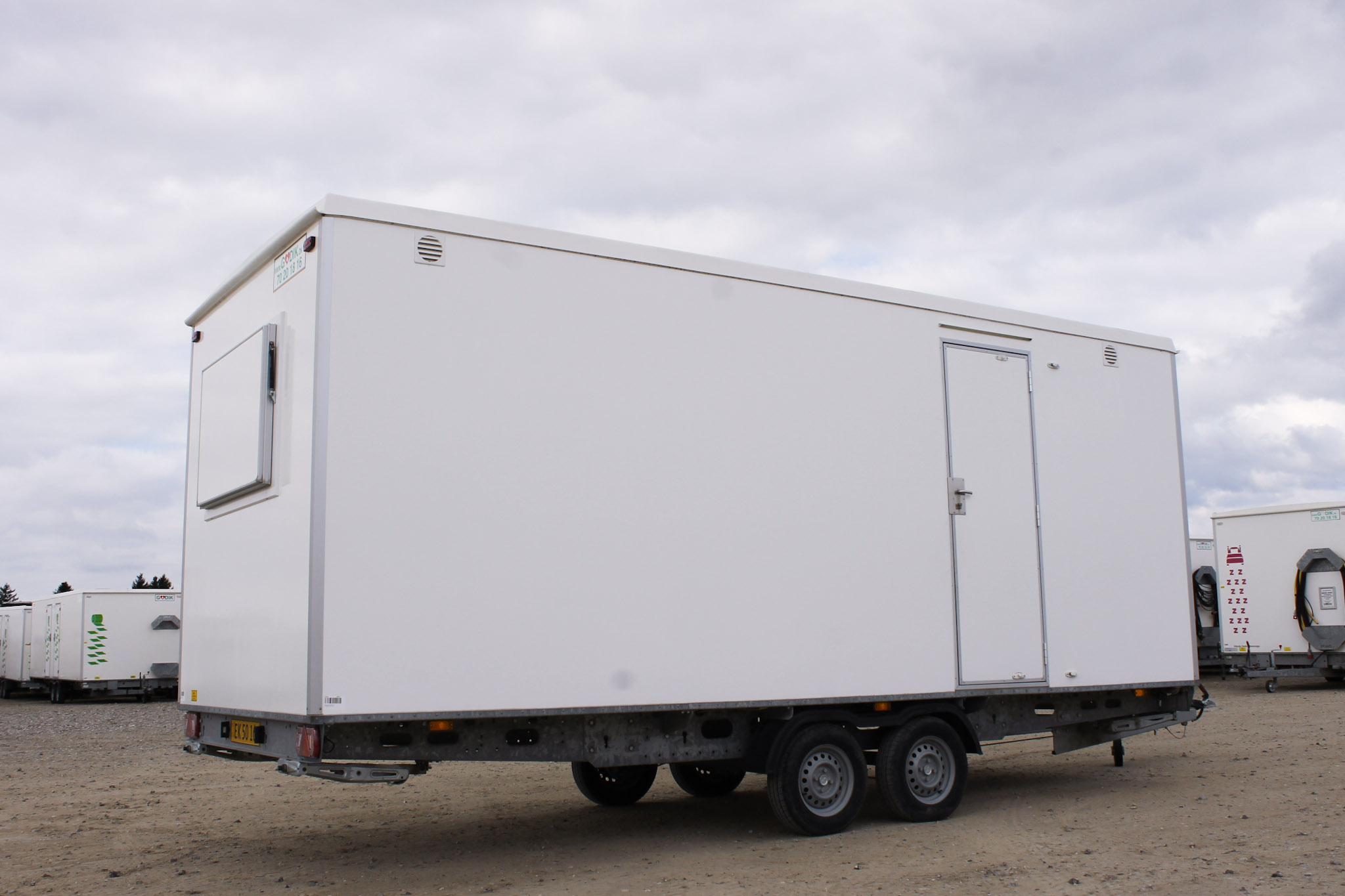Manskapsvagner med sex säten, vardagsrum och kök. Praktisk lösning för byggarbetsplatser.