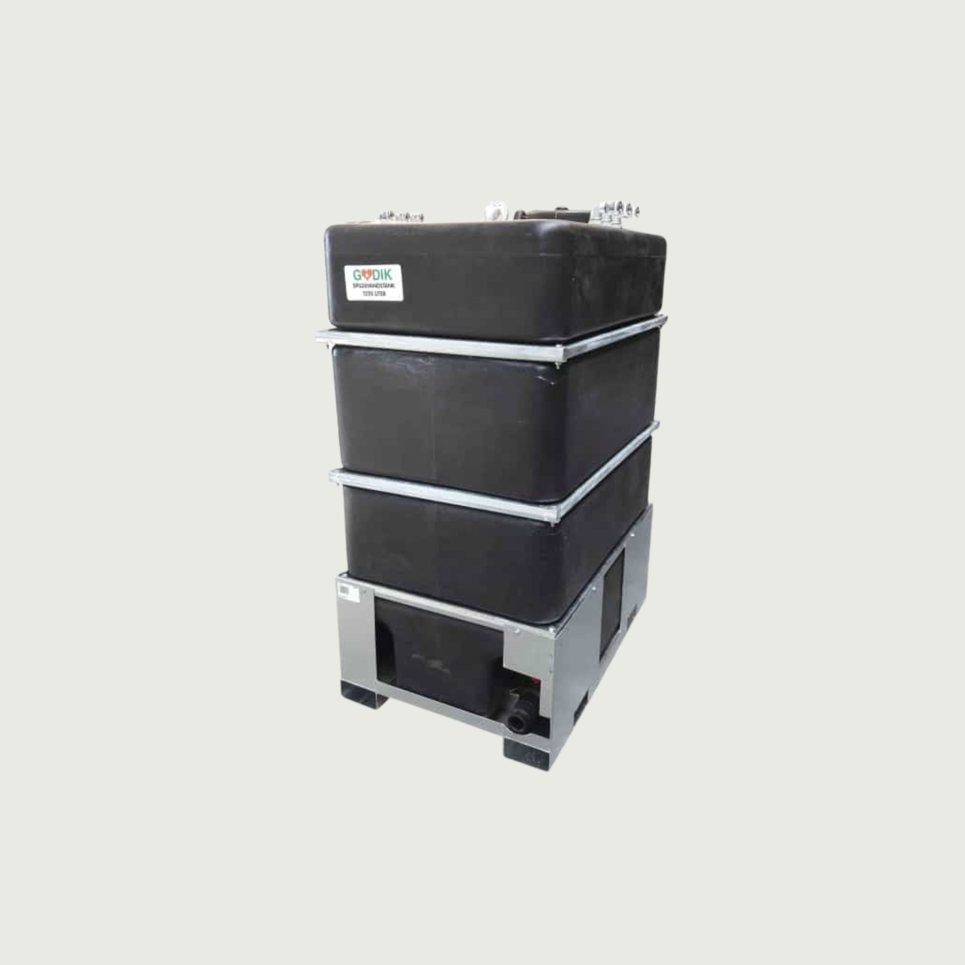 - 1.250 liters vattentank på galvaniserat stativ med gaffelfickor och lyftöglor.