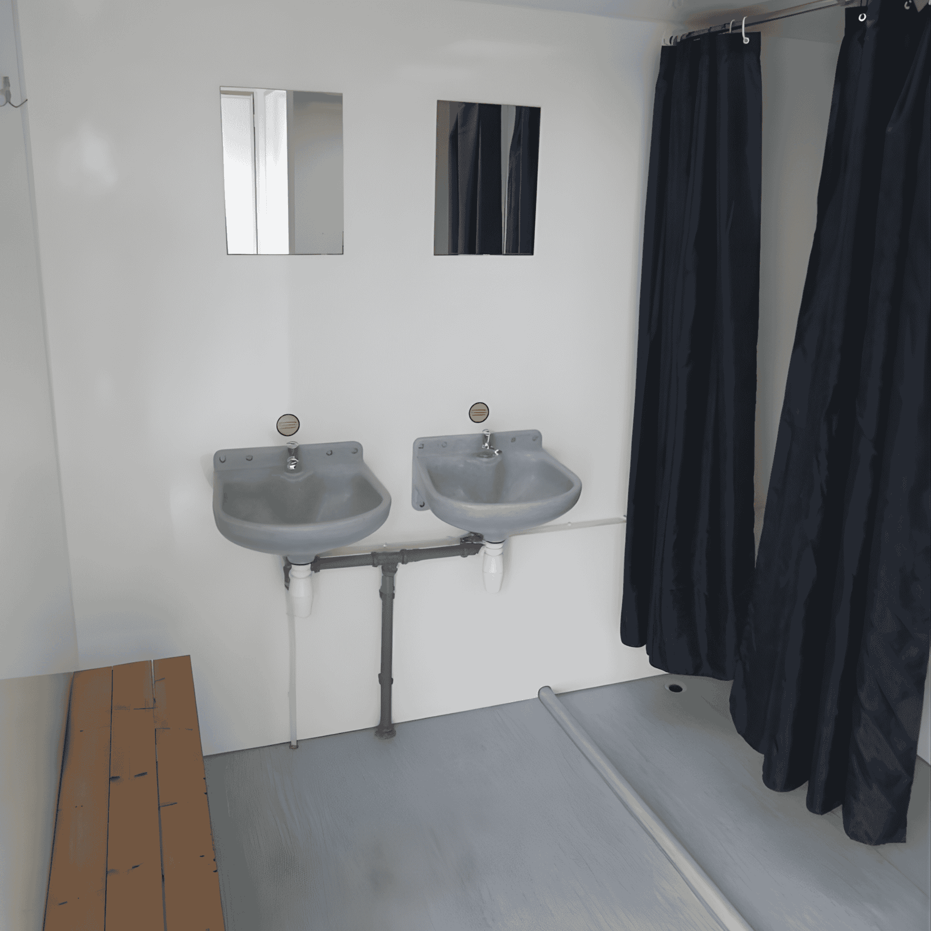2×4 badrum med belysning, elvärme, 4 handfat, 2 spoltoaletter, hållare för madame-påsar, spegel, bänk och jumbo toalettpappershållare. [ProductCategory|BathAndWater|Description6Text2}