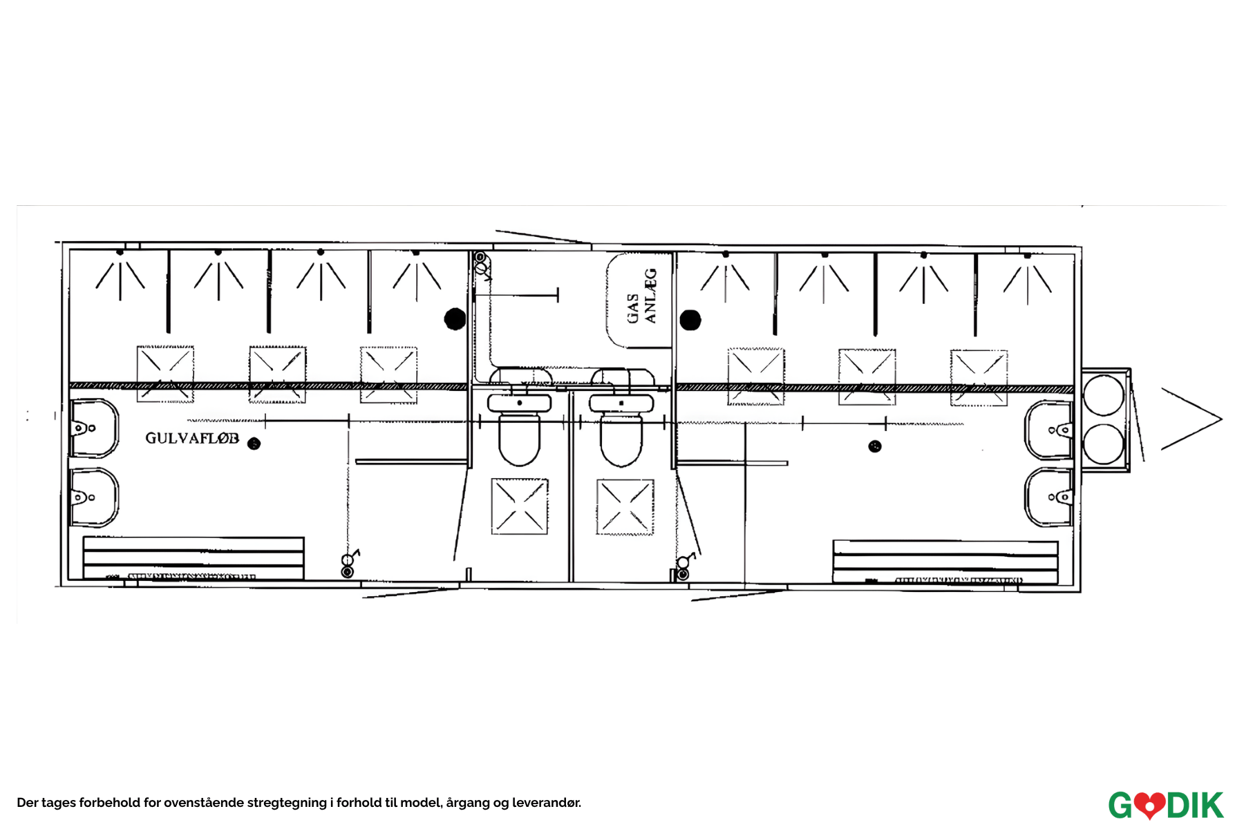Kombinerad badrums- och toalettlösning med åtta duschar och två toaletter. Gasvärme ger stabil temperatur och effektiv drift, även under hög belastning.