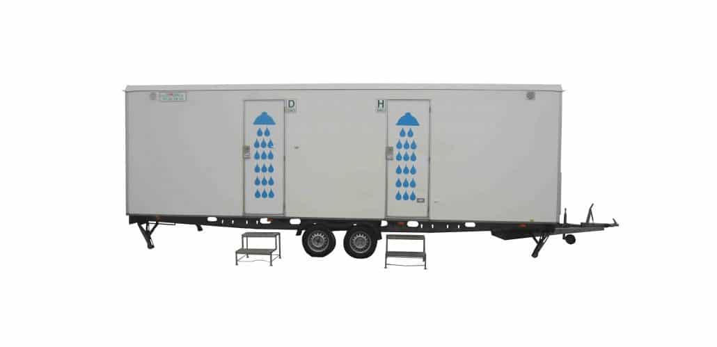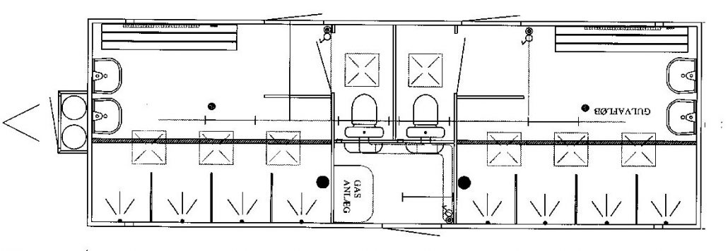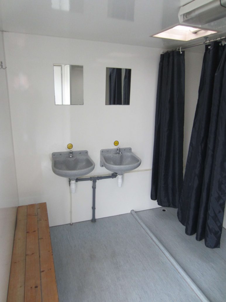 2×4 duschar med belysning, elektrisk uppvärmning, 4 handfat, 2 vattenspolande toaletter, sanitetspåse hållare, spegel, bänk och jumbo toalettpappershållare.