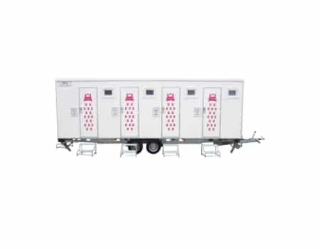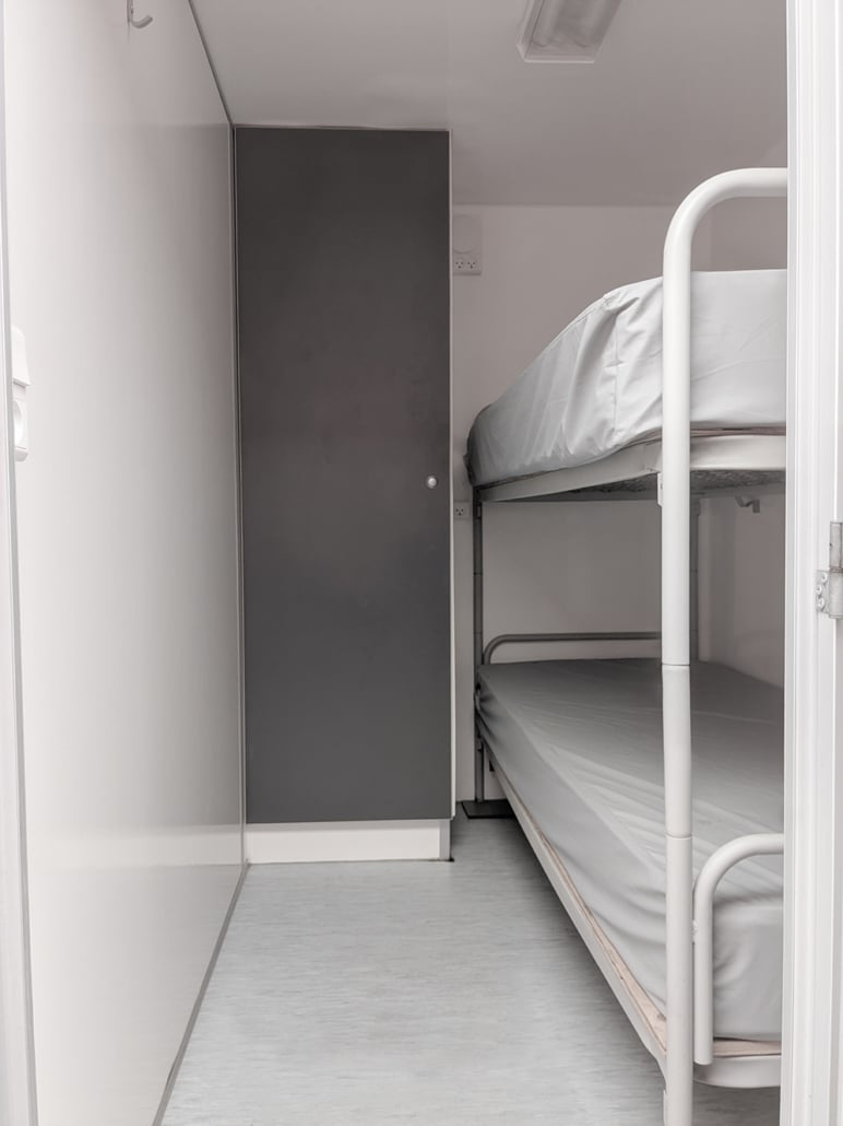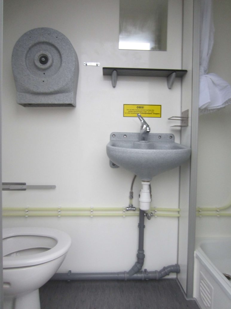 4 sovrum med 1 våningssäng, garderob, badrum med dusch, toalett, handfat och teknikrum med avloppskvarn.