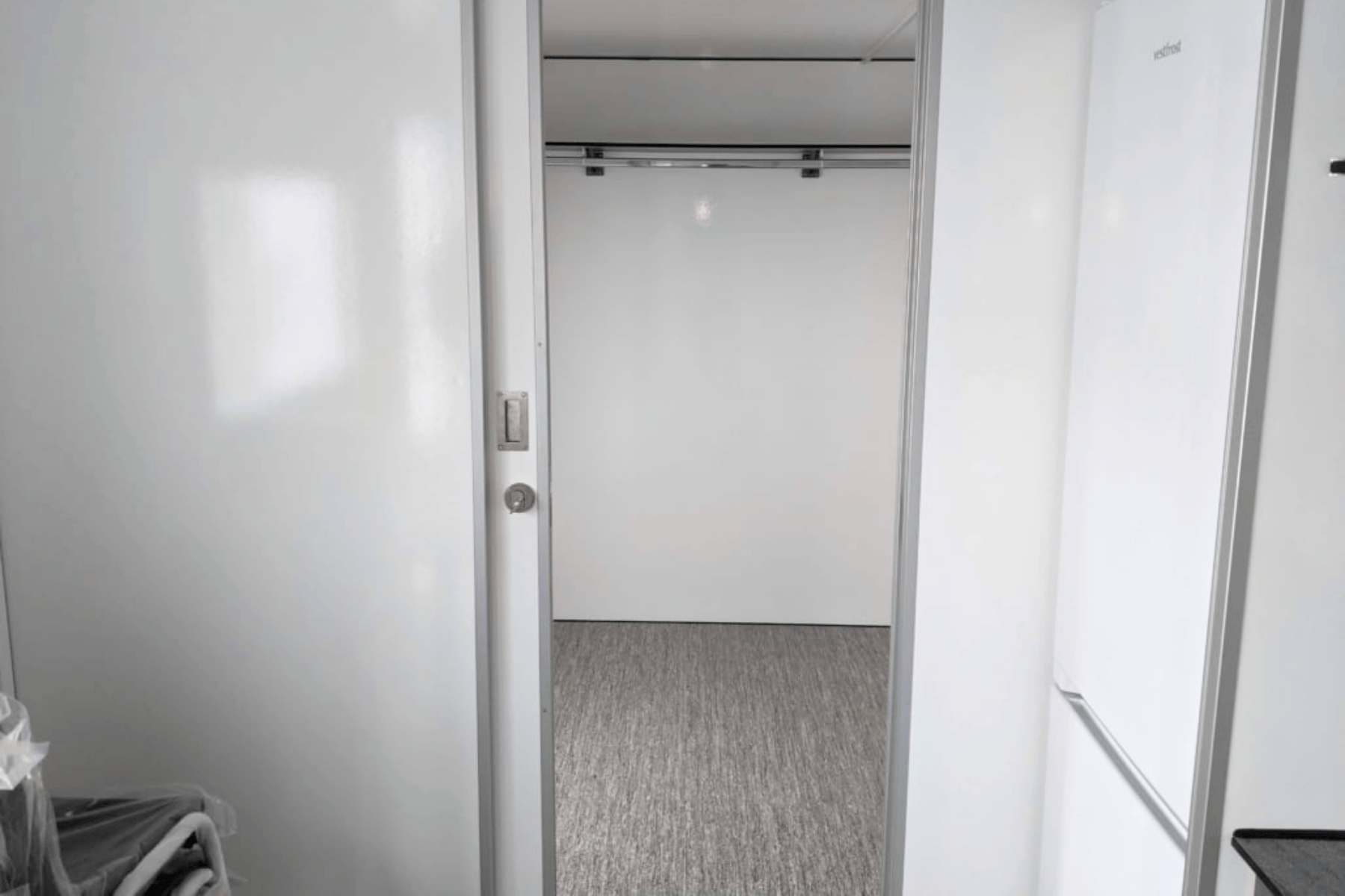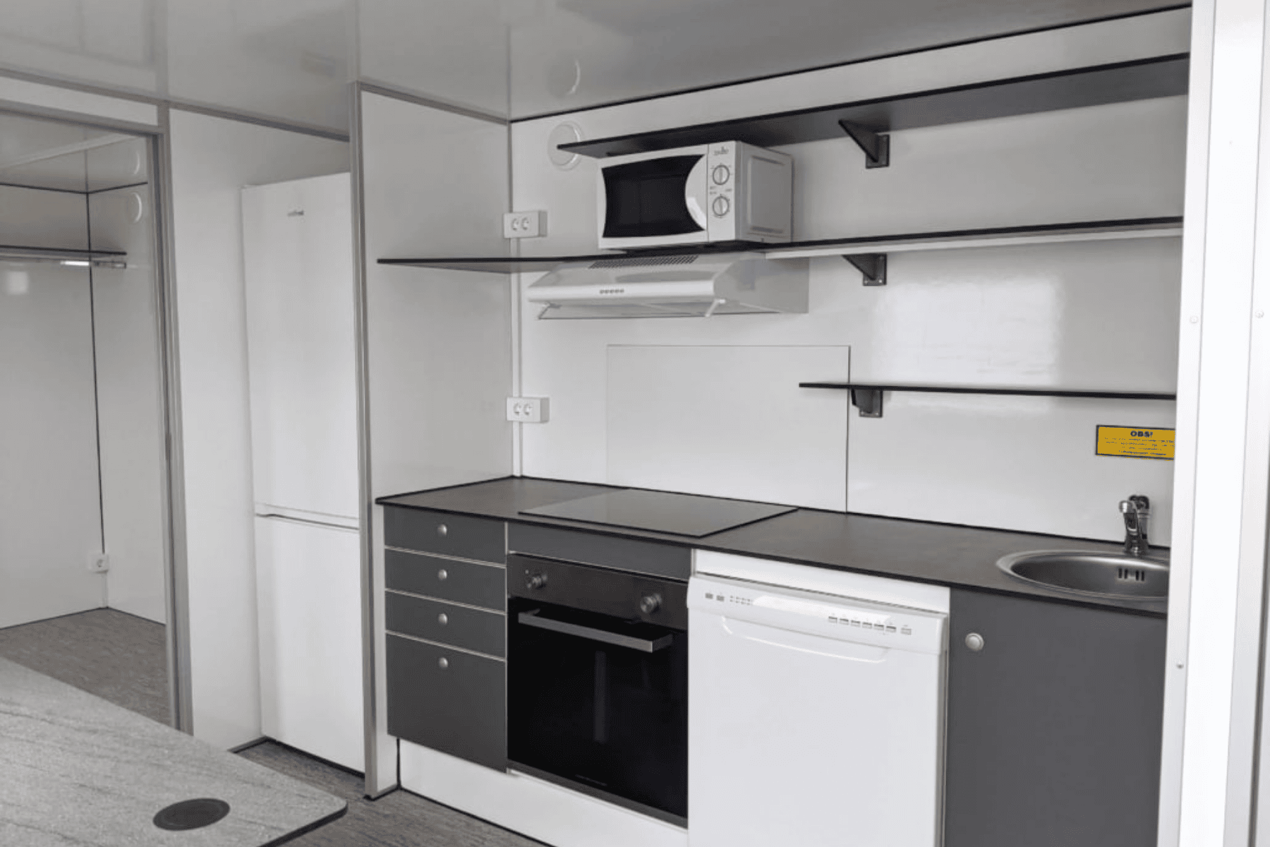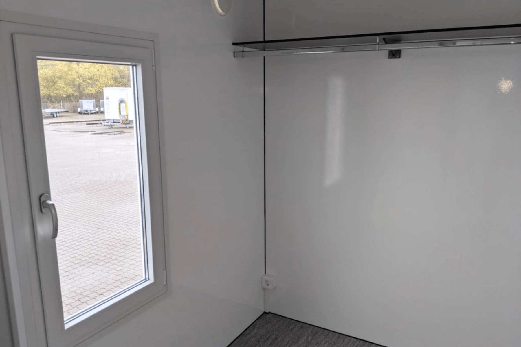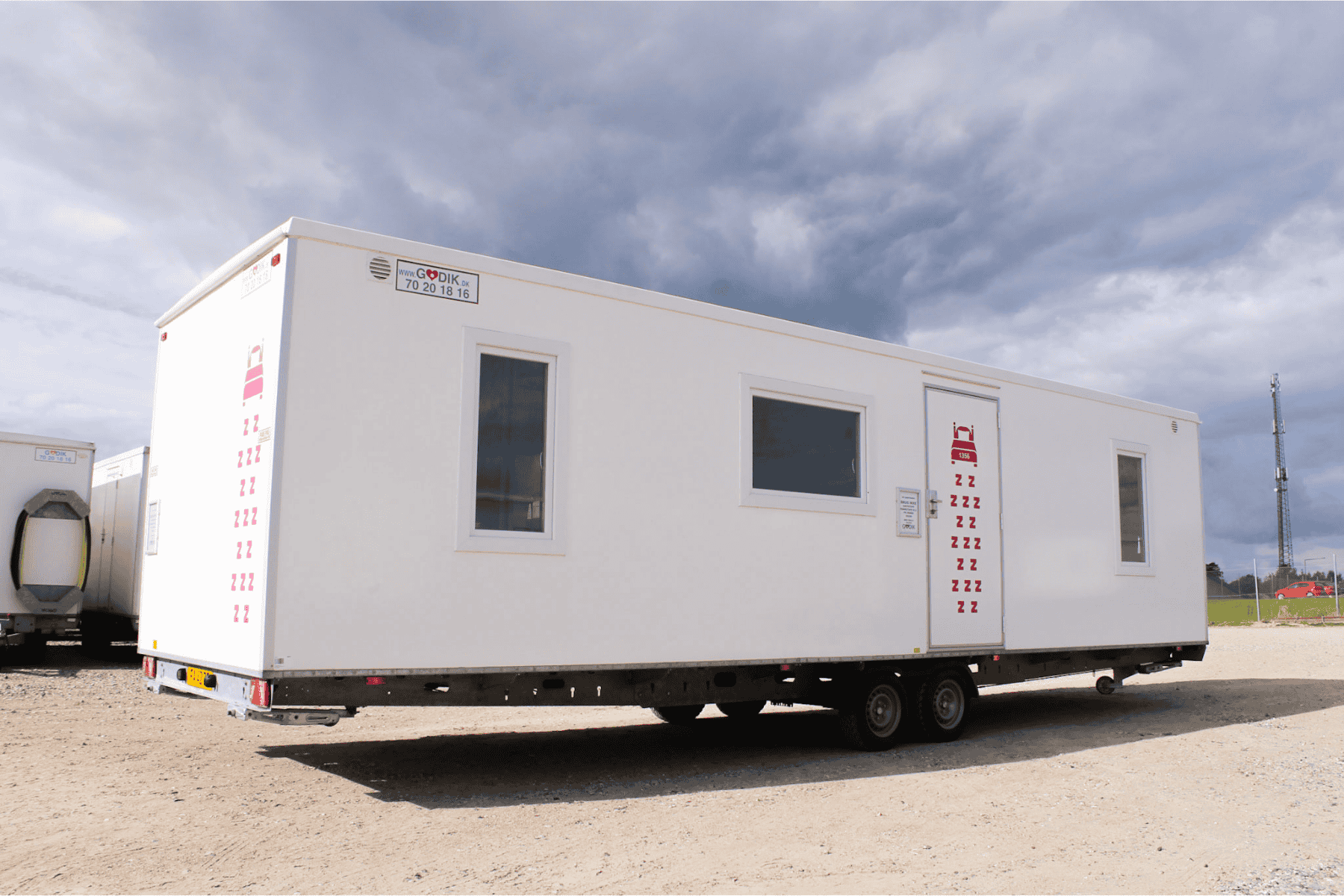 9 meter lång husvagn med fyra bäddar, vardagsrum, badrum och kök. Perfekt för längre projekt eller evenemang som kräver bekvämt boende.