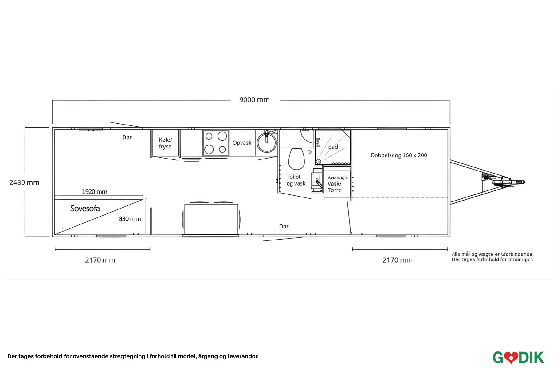 9 meter husvagn med plats för 4 personer, kök, tvättmaskin och badrum/toalett
