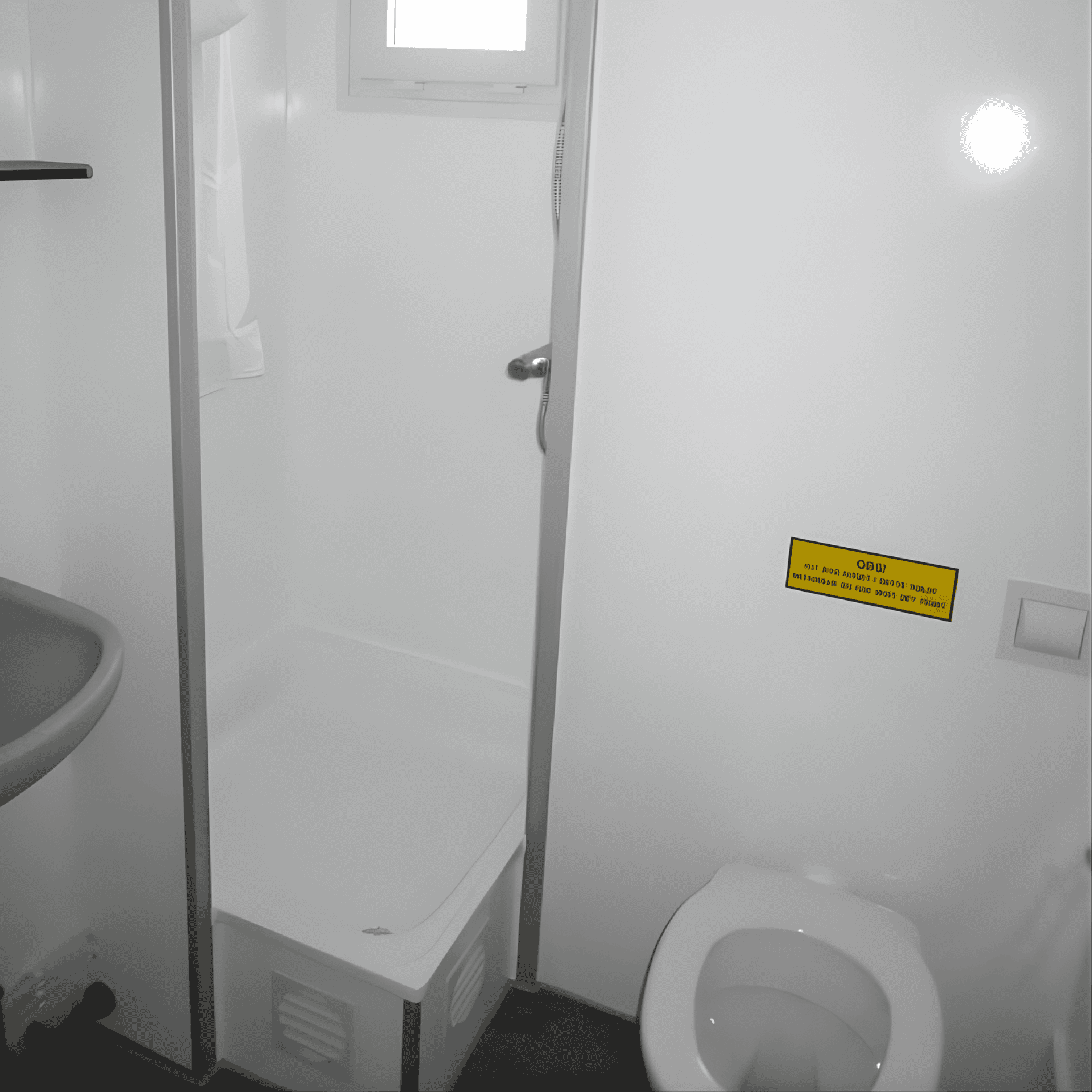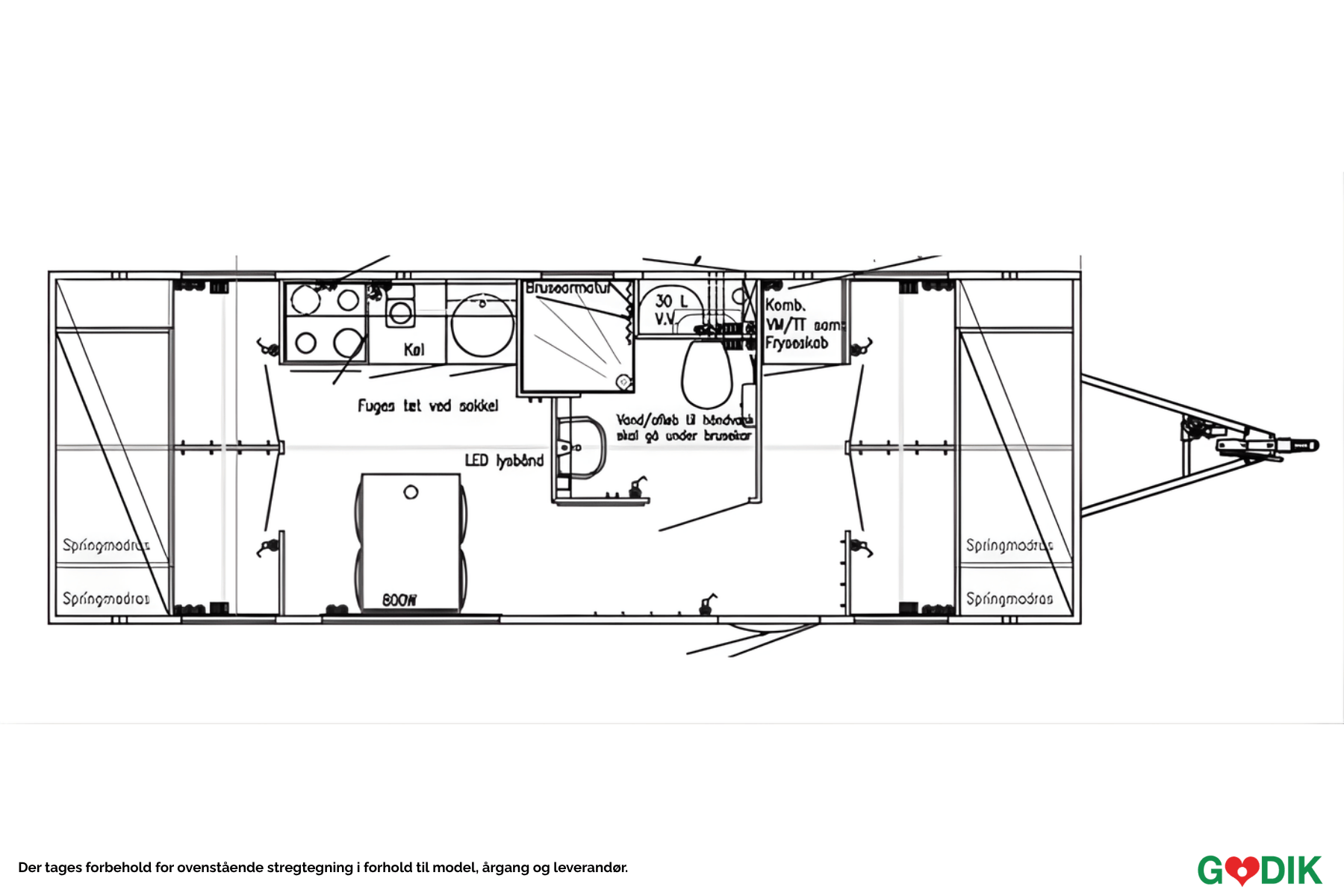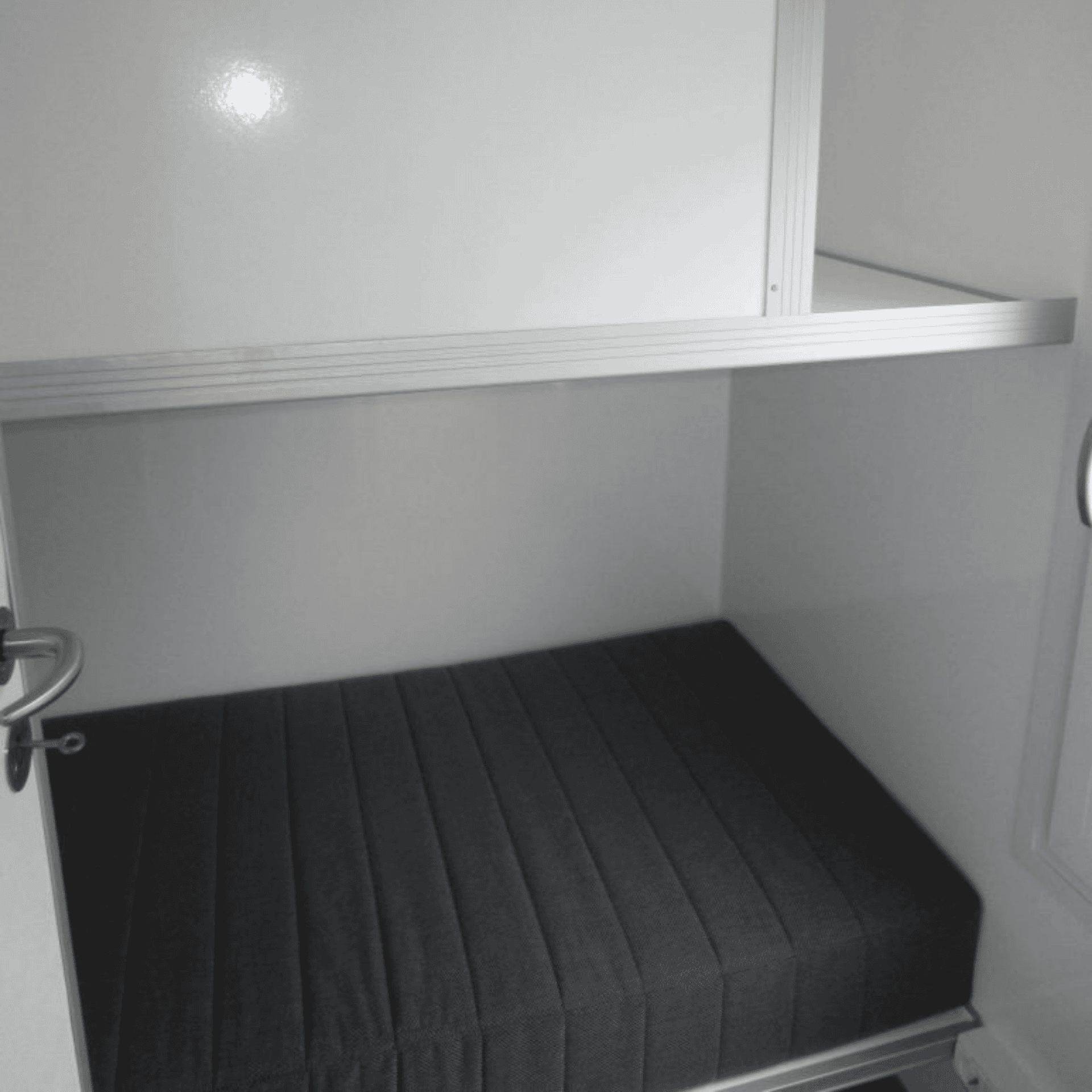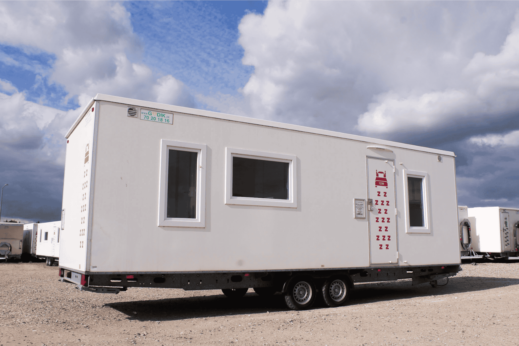 Robust husvagn för hantverkare med fyra individuella sovplatser, kök och badrum. Utformad för praktisk användning och snabb uppställning.