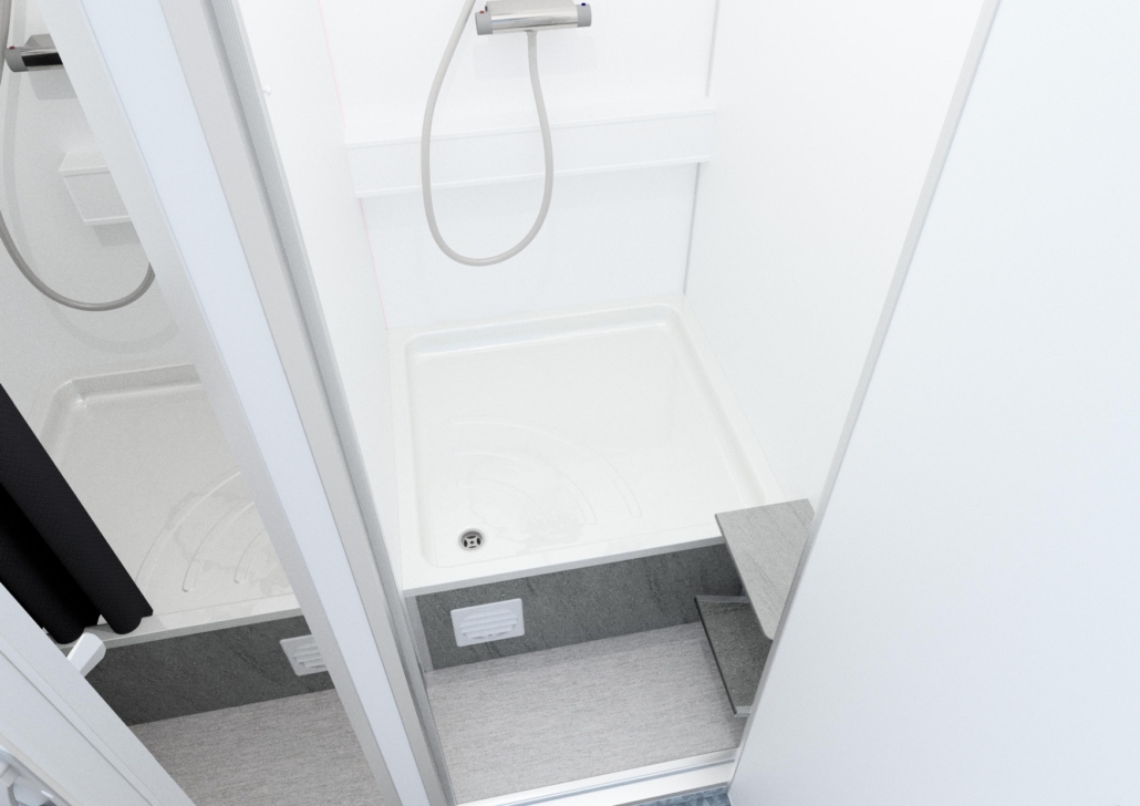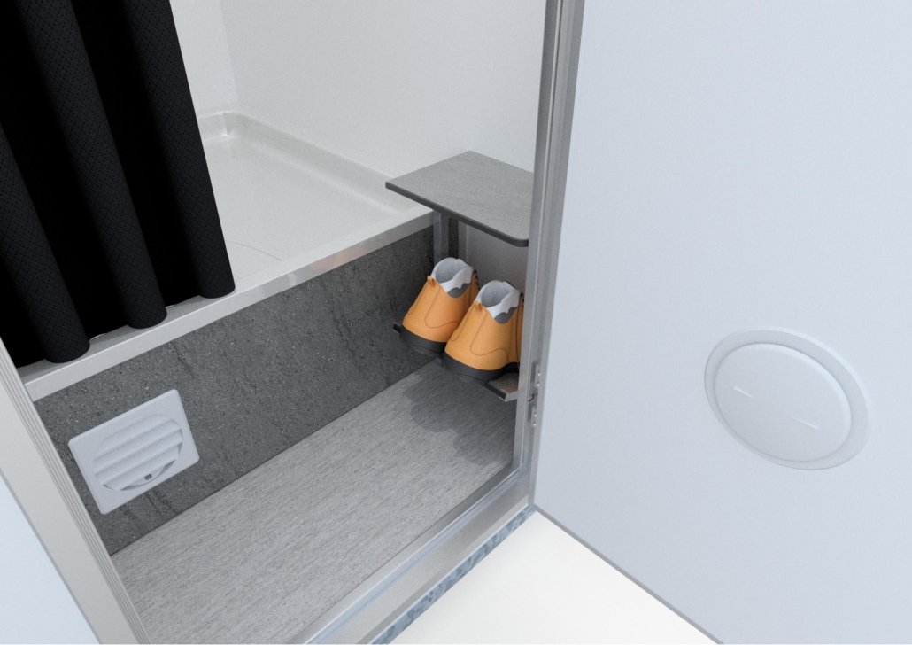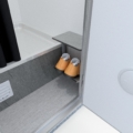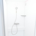 Ljus, golvvärme, duschkabin, duschhylla, bänk och liten skohylla