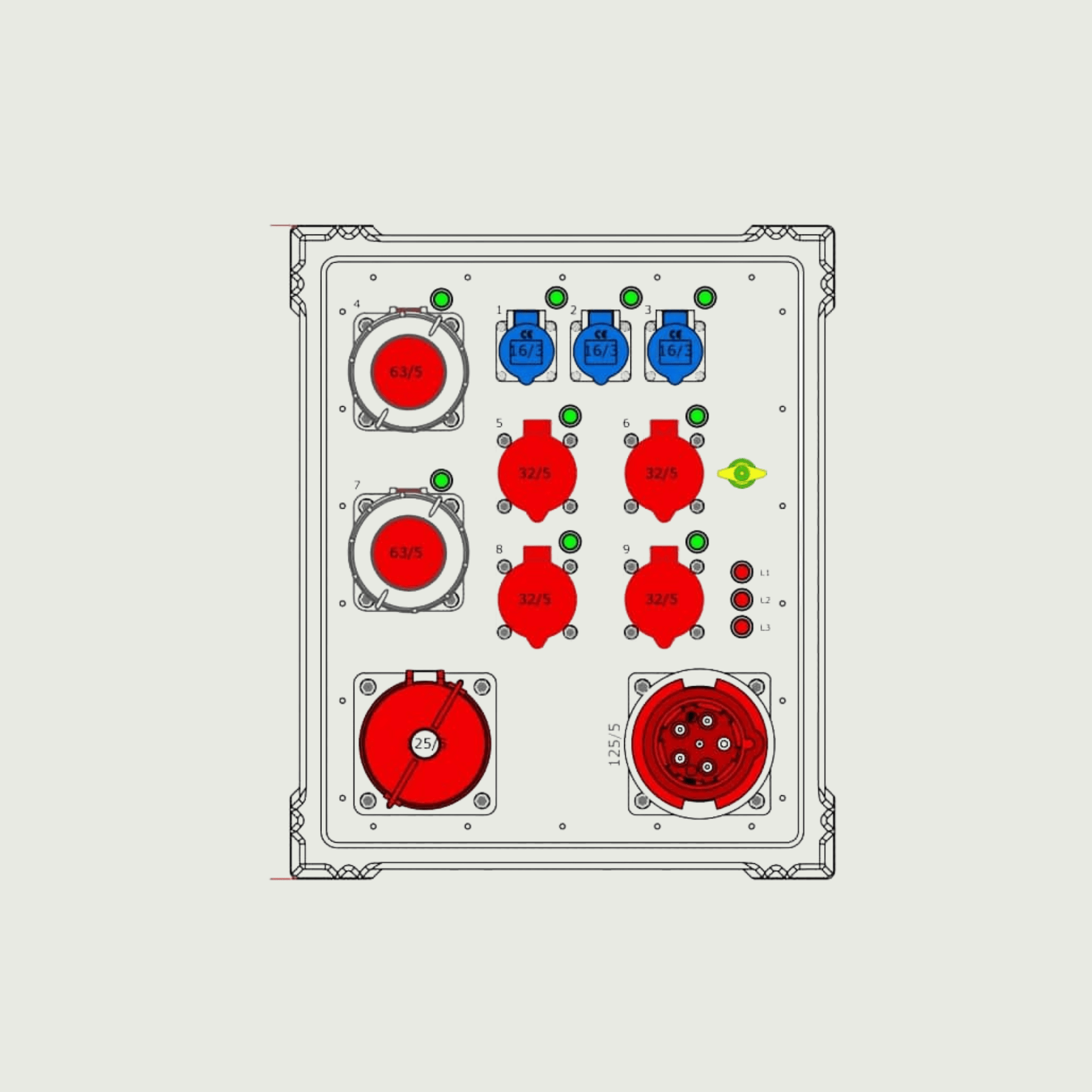 1x 125A. 2x 63A. 4x 32A. 3x 230V blå CEE.