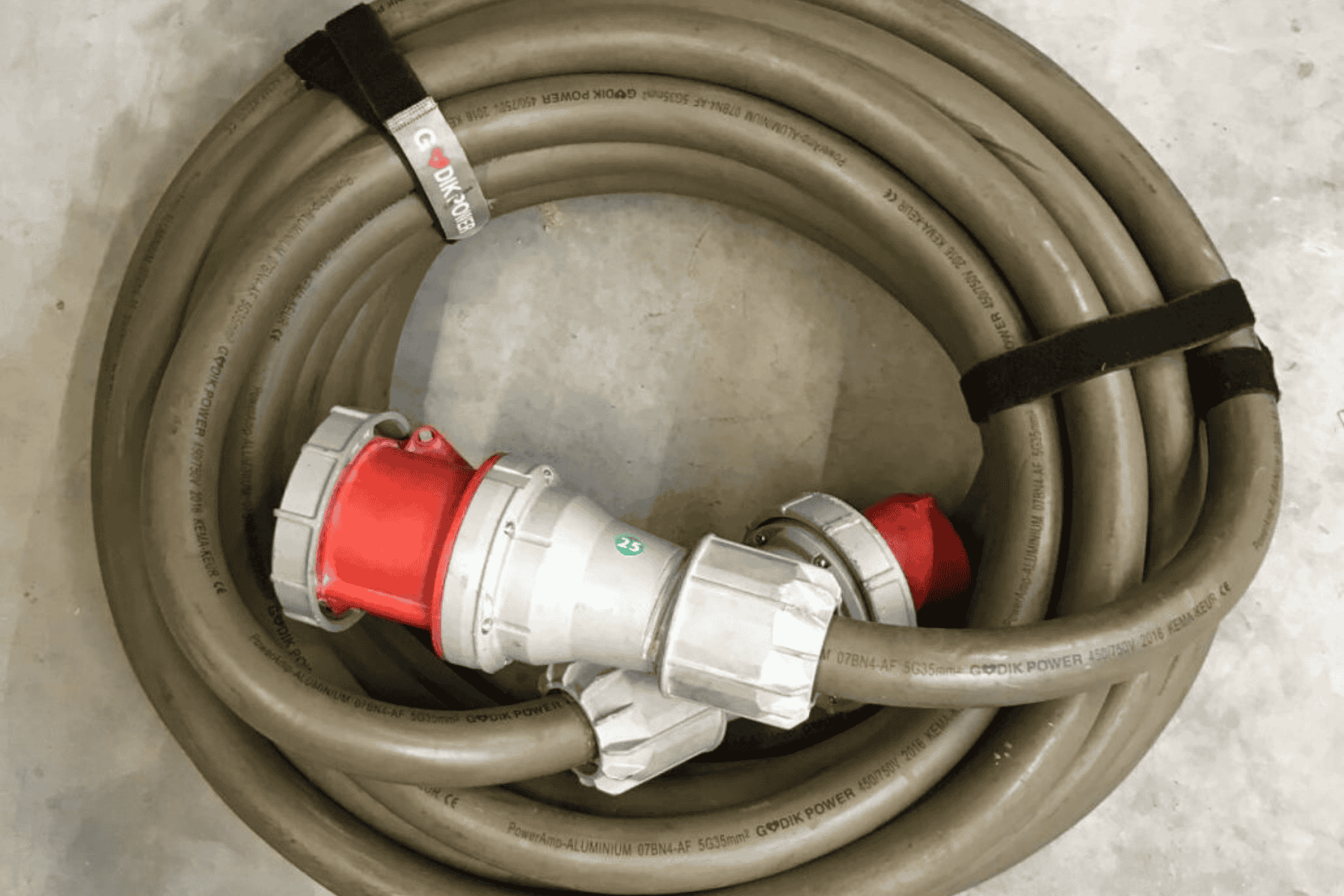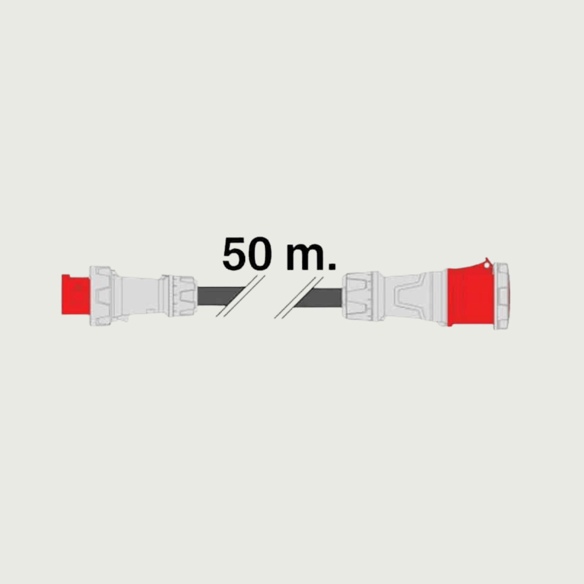 50 meter elkabel, 3x 125A/400V röd CEE-kontakt. Max per kabelbox: 2HBOX.