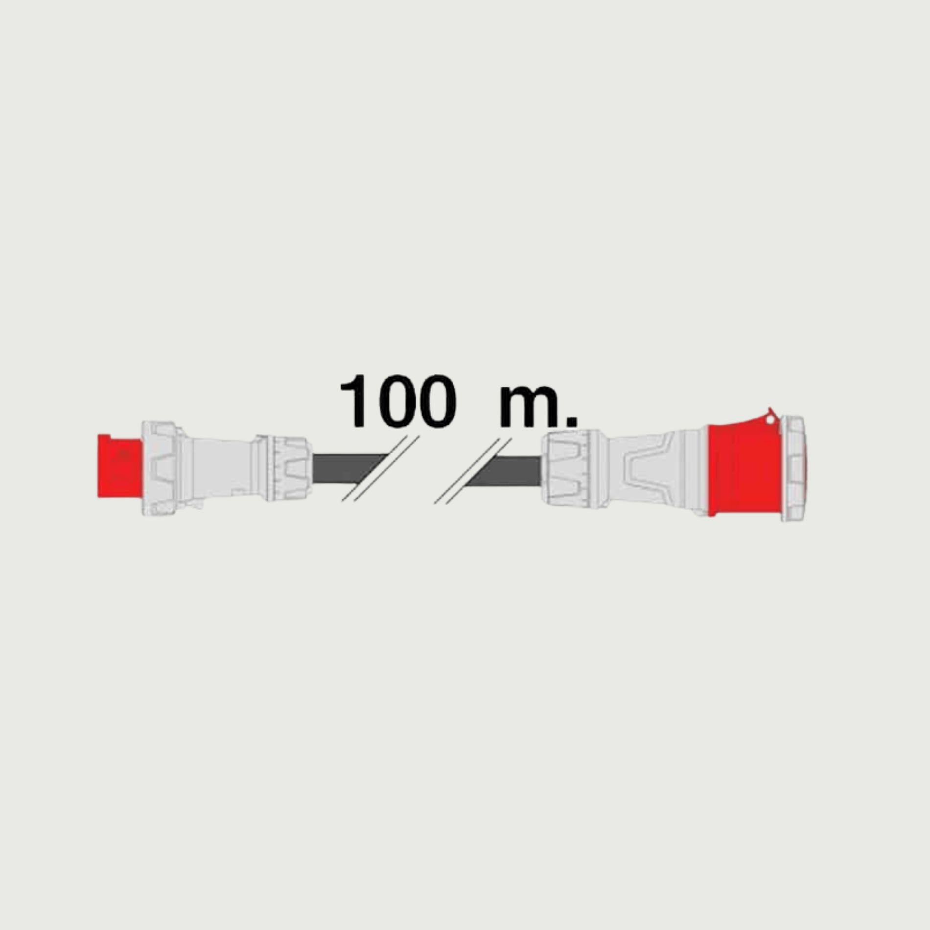 100 meter elkabel, 3x 63A/400V röd CEE-kontakt. Max per kopplingsdosa: 2HBOX.