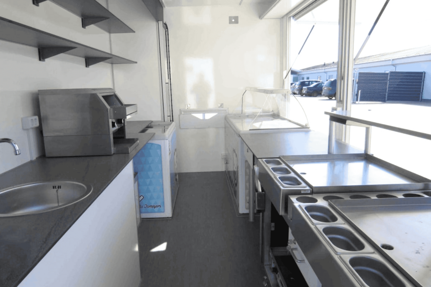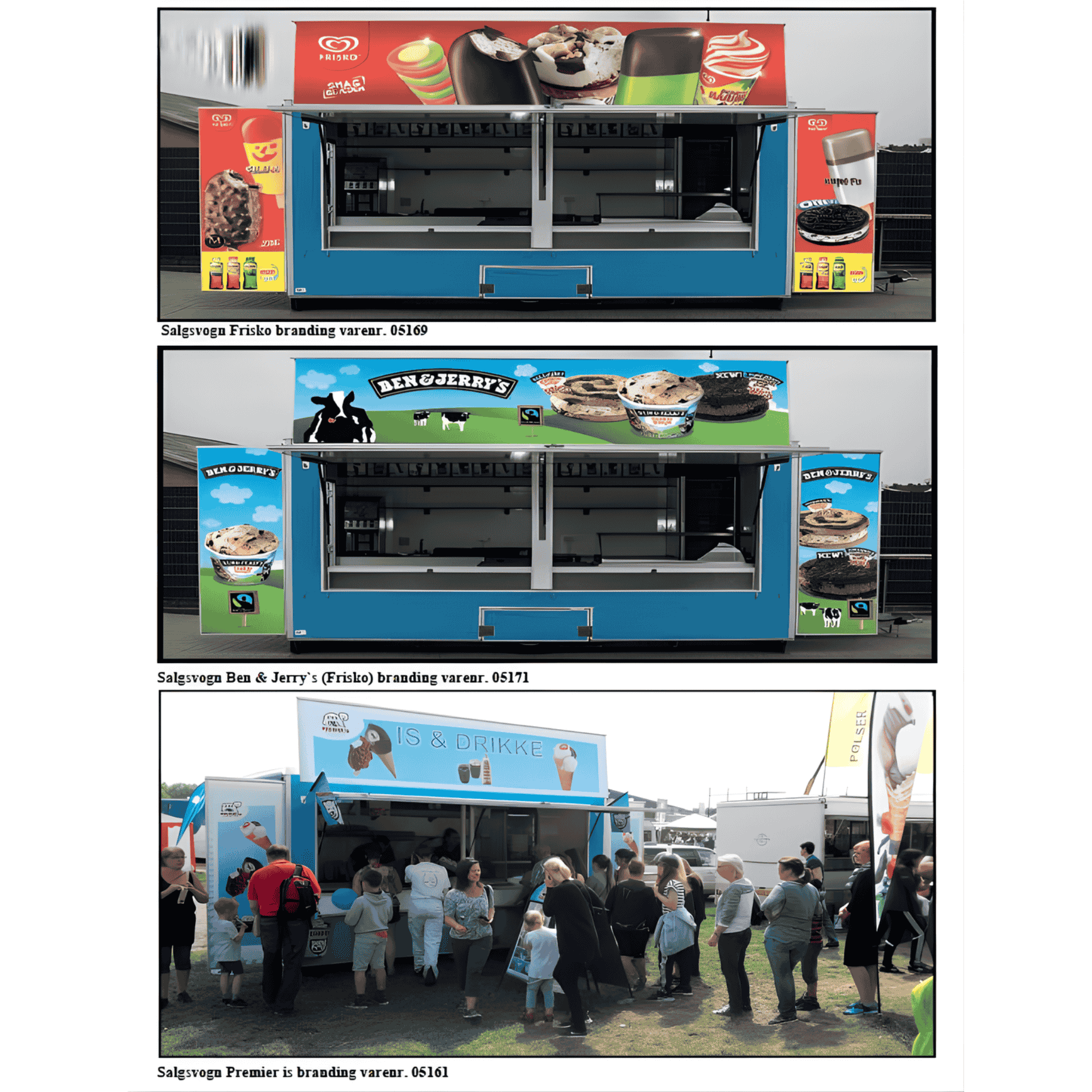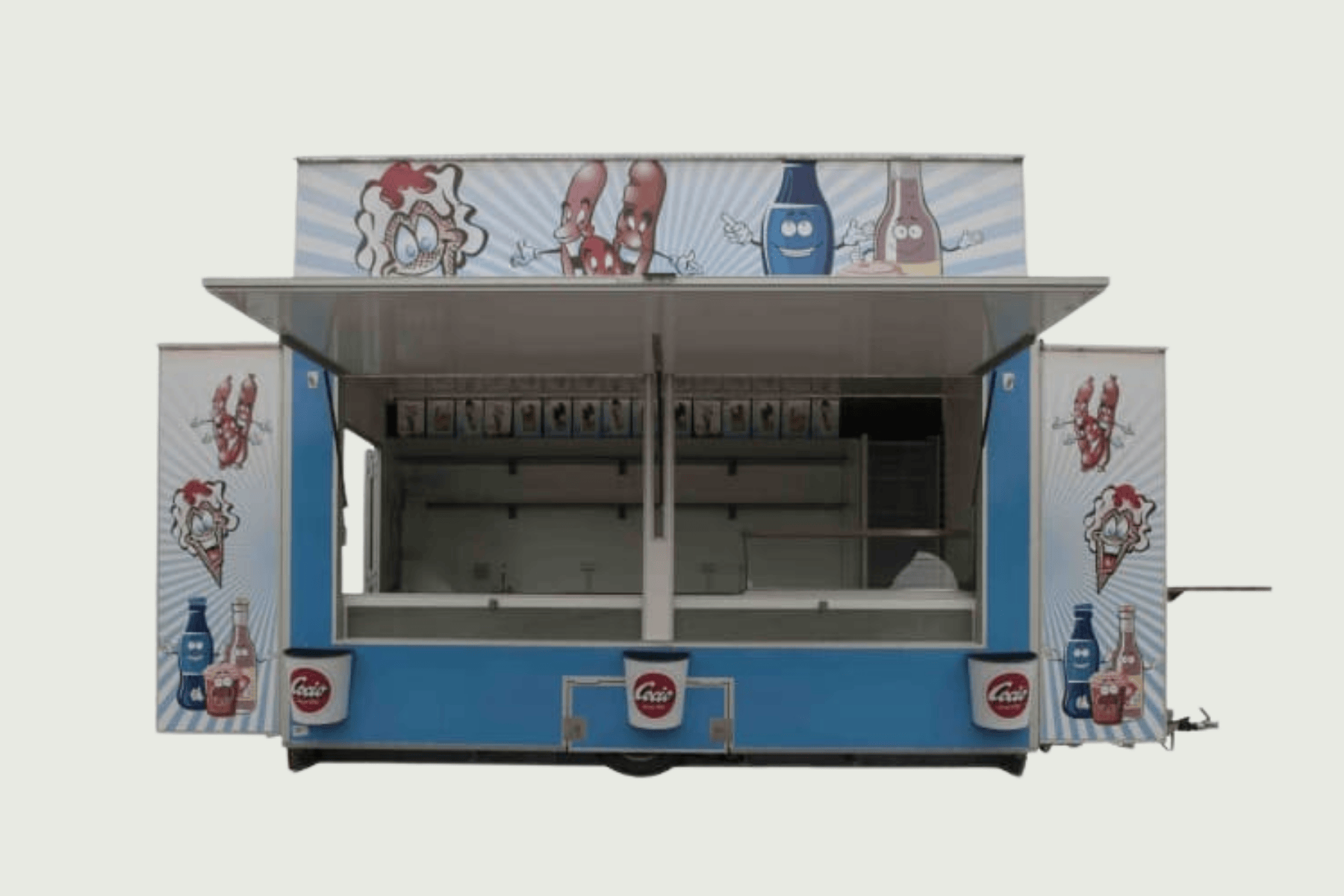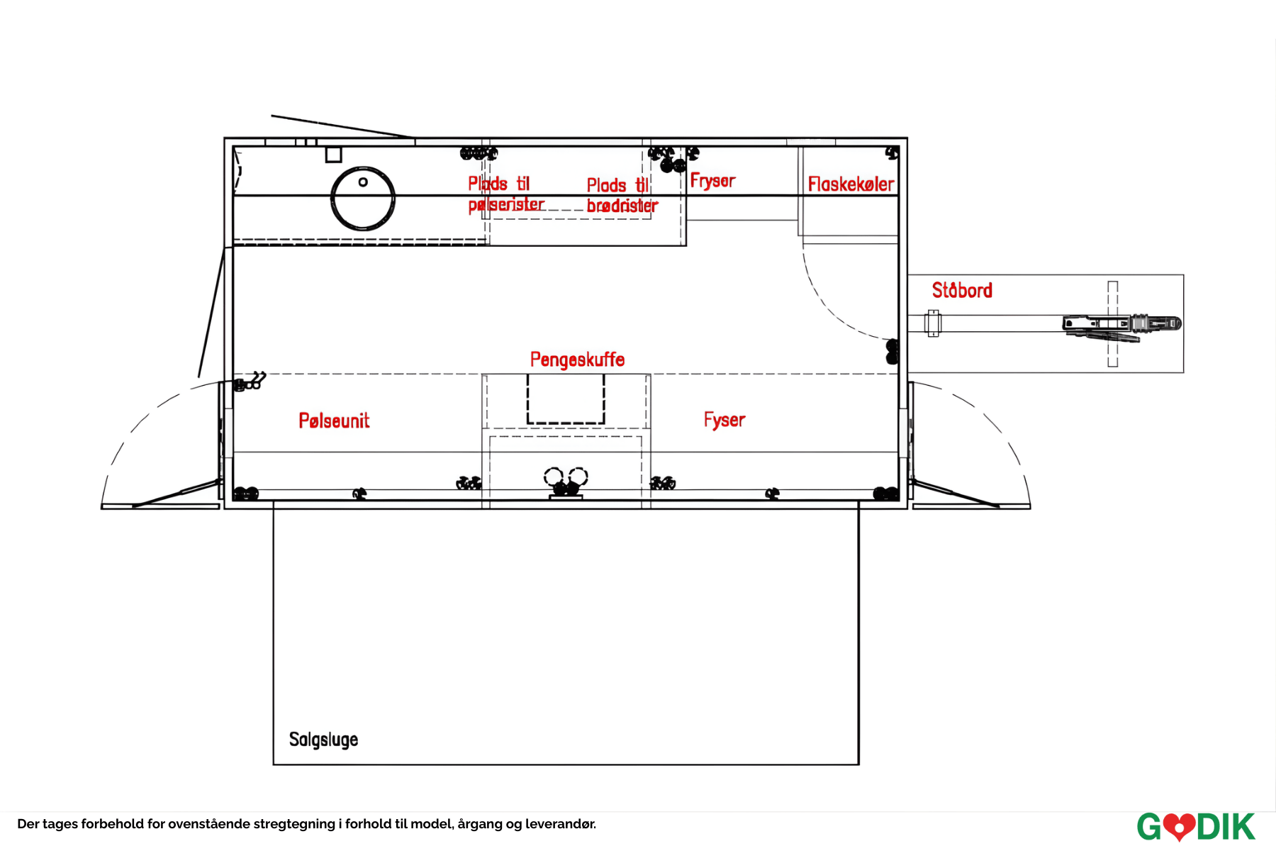 1 försäljningslucka med disk, stor frysbox eller korvenhet med stekplattor och brödrost, frys för gammaldags glass, frys för pinnglass, hyllor över disk med LED-belysning, bakvägg med vask, frysbox, flaskkylare, takmonterad skylt för prislistor och 2 rader LED-belysning, kassalåda, tvålhållare, pappershållare, knivhållare, utvändigt klaffbord, toppskylt med LED-belysning avsedd för lätt avtagbar folie, 2 sidoskyltar med LED-belysning avsedda för lätt avtagbar folie.