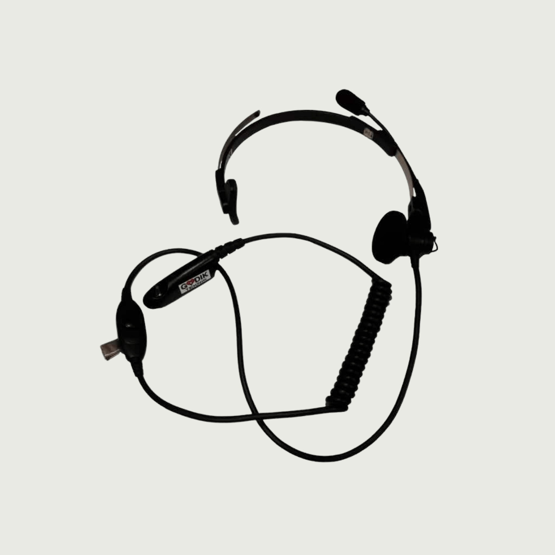 Lätt headset med PTT-knapp, mono-hörlur och justerbar mikrofon. För analog radio.
