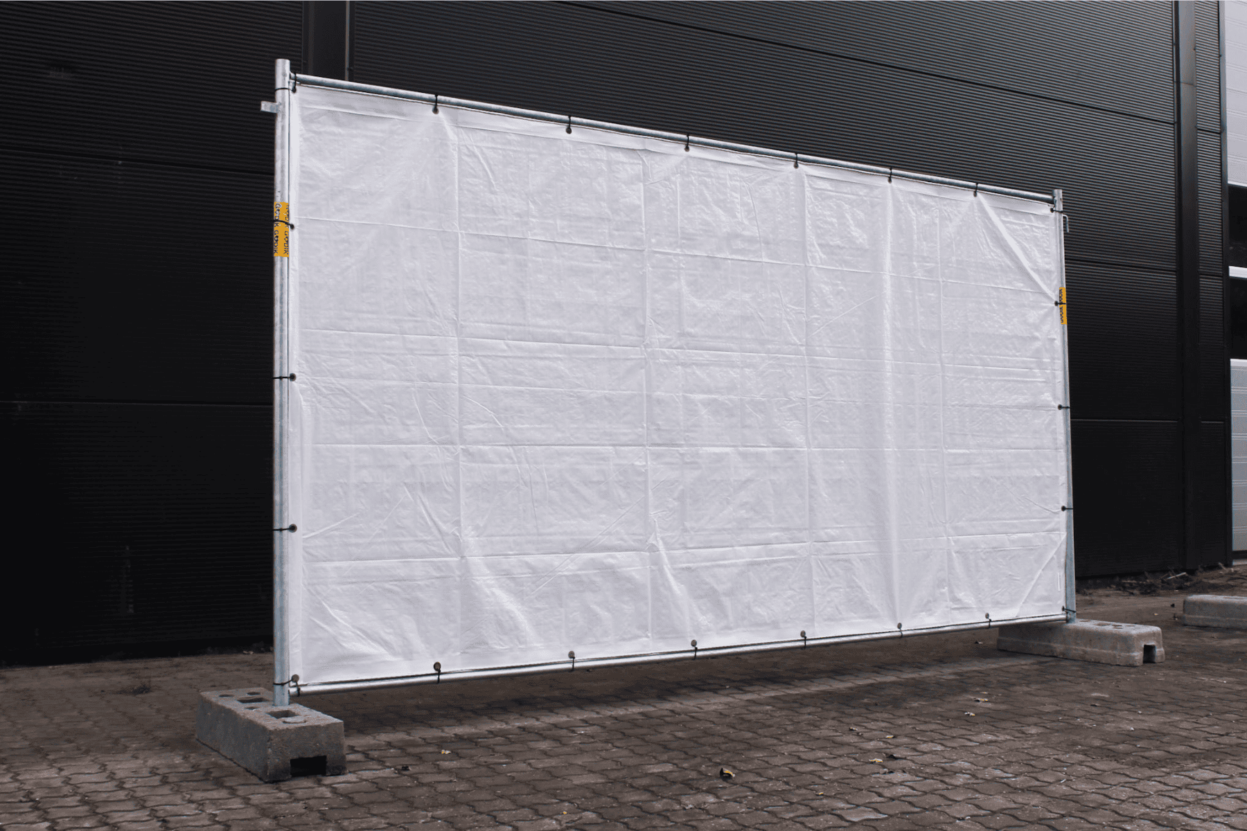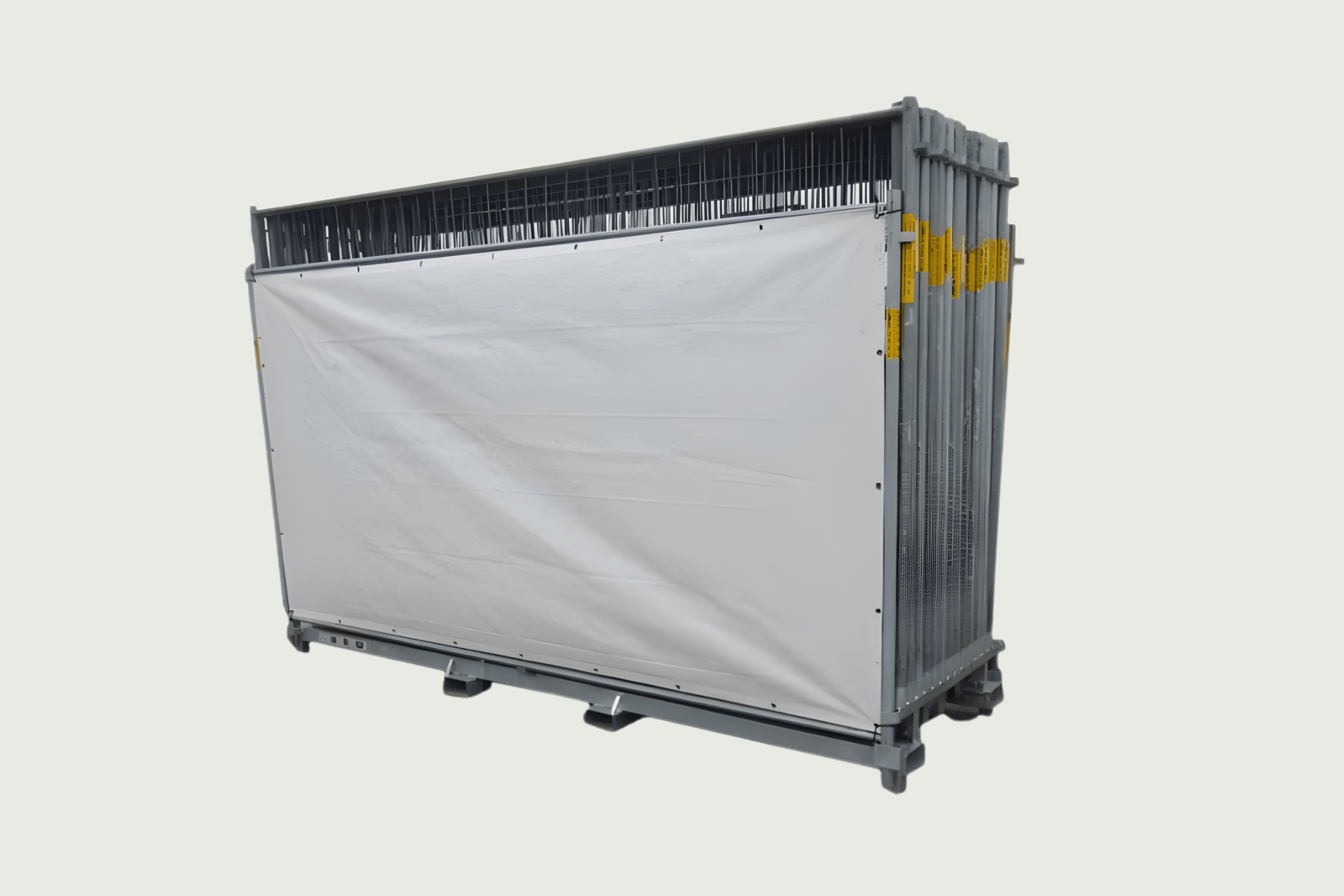 - 1 pall högt stängsel med monterad vit flamskyddad stängselduk. Mått för 1 stängsel: H: 200, L: 350 cm. Vikt per styck: 21 kg. Mått för 1 kloss: H: 14, L: 68, B: 25 cm. Vikt per styck: 26 kg.