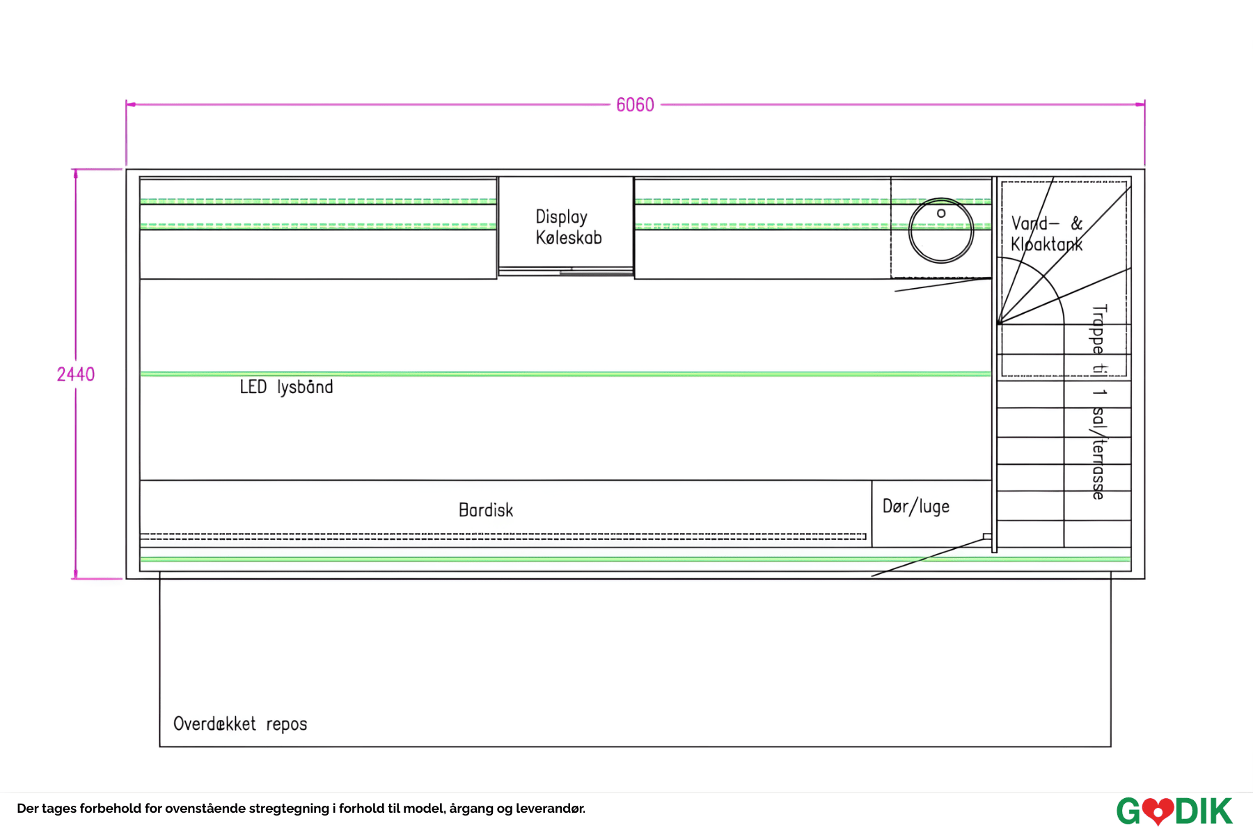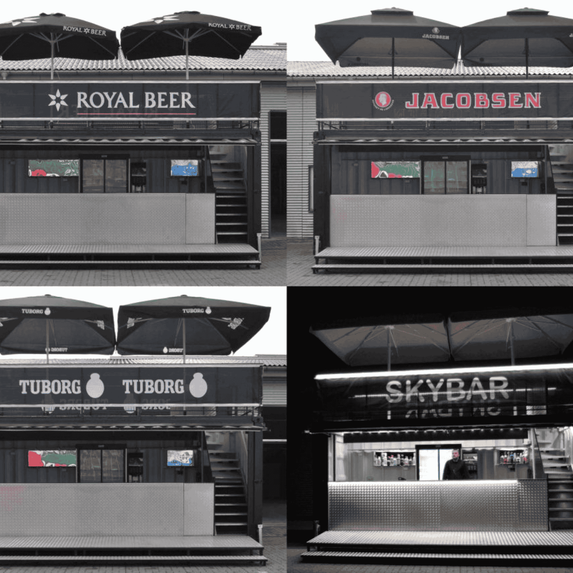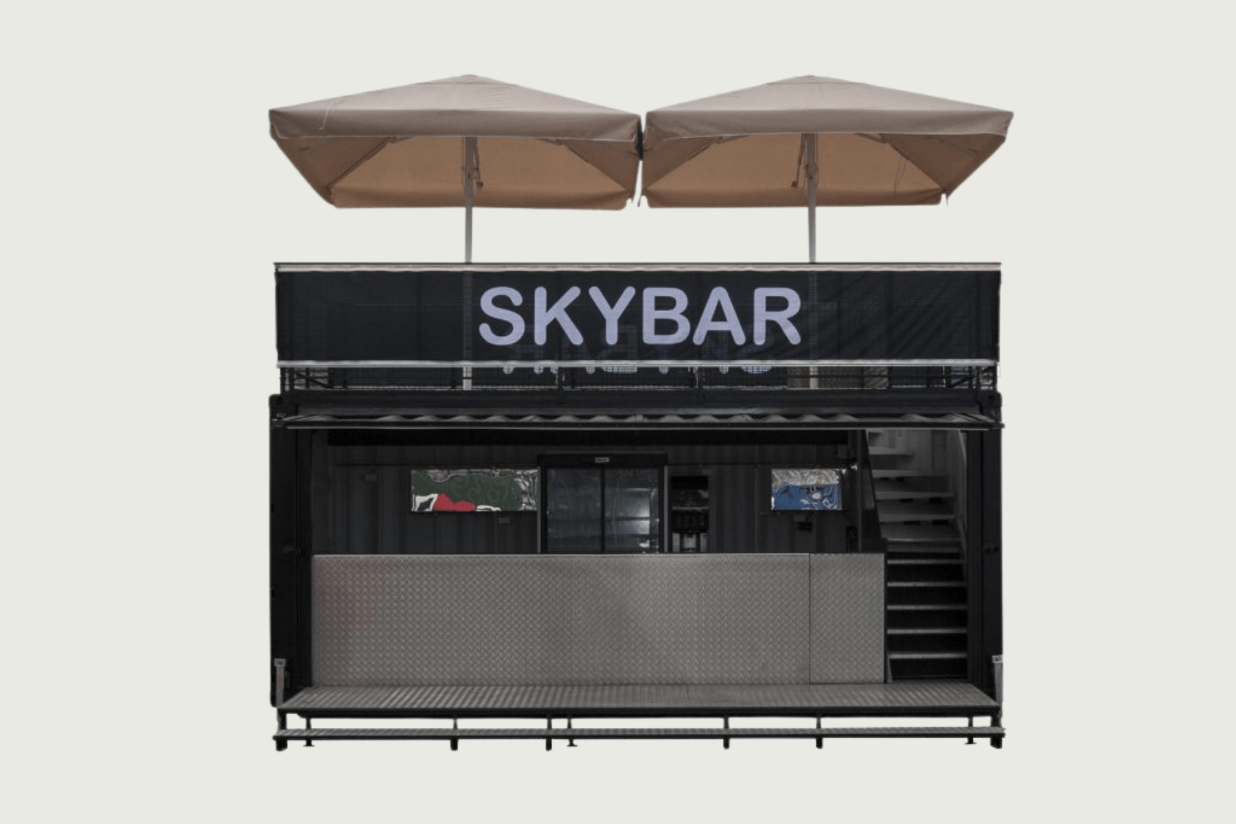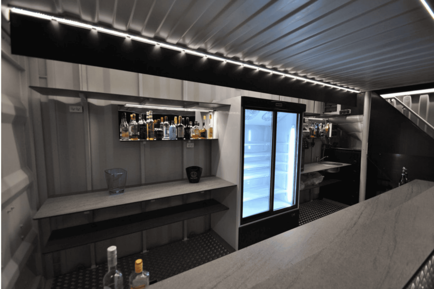Vid kylen finns plats för 2 dubbla slush-ice-maskiner för färdigblandade drinkar. Takterrassen har plats för 2 parasoller på 3x3 meter.