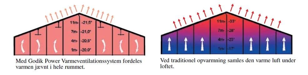 En stor mängd varm luft blåses in på 3-4 meters höjd, vilket skapar ett stort övertryck i rummet och därmed undviker drag.