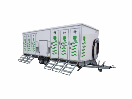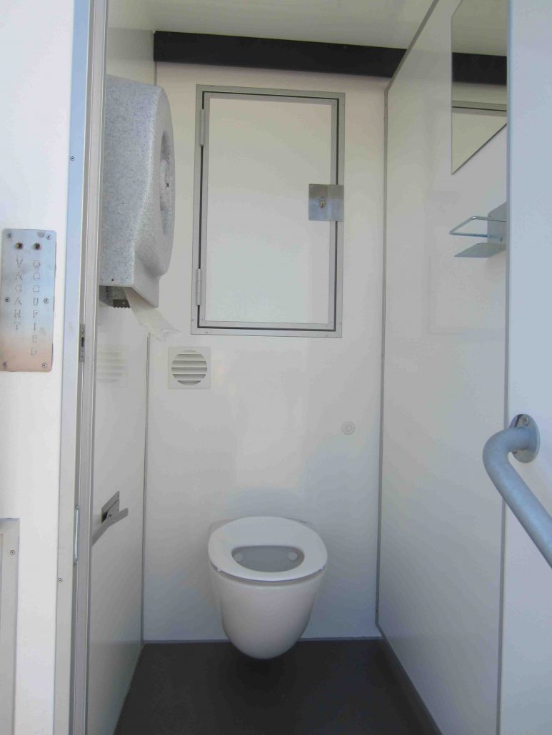 LED-belysning på utsidan och insidan, radiator, hållare för Alcogel 0,3 liter, spegel, krok, hållare för toalettpapper, hållare för sanitetspåse, ljusindikator för “ledigt/upptaget” vid entrédörrarna, fast trappa med ledstång.
