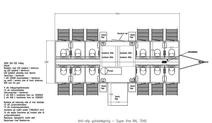 - Tank: 2×600 l. vatten / 2×1000 l. avloppsvatten