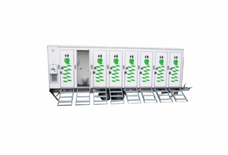 LED-belysning exteriör och interiör, radiator, hållare för Alcogel 0,3 l., spegel, krok, hållare för toalettpapper, hållare för sanitetspåse, ljusindikator för “ledig/upptagen” vid entrédörrar, fast trappa med ledstång. Kan monteras med banderoll i slutet med kedjor i topp och botten H. 153 cmB. 198 cm.